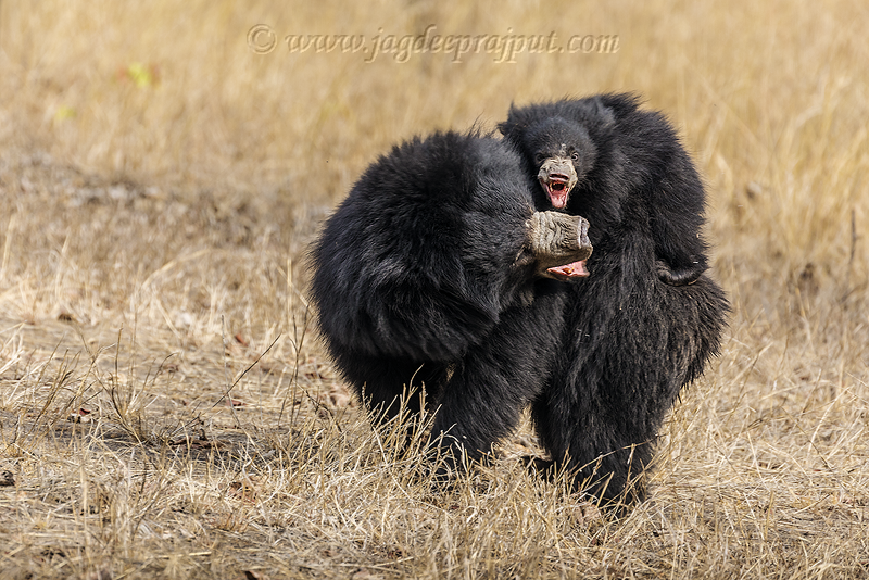 Sloth Bear getting angry with cub, Satpura National Park, India.