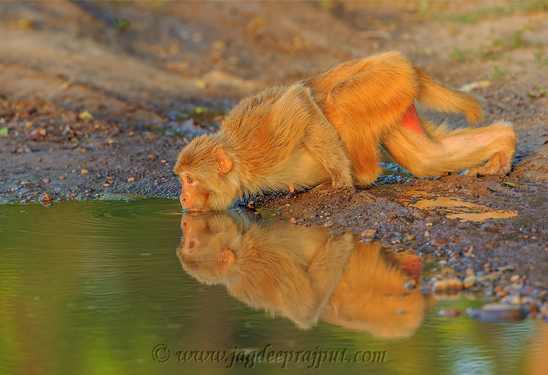 Rhesus Monkey drinking from the rain-filled puddle, Corbett National Park, India.